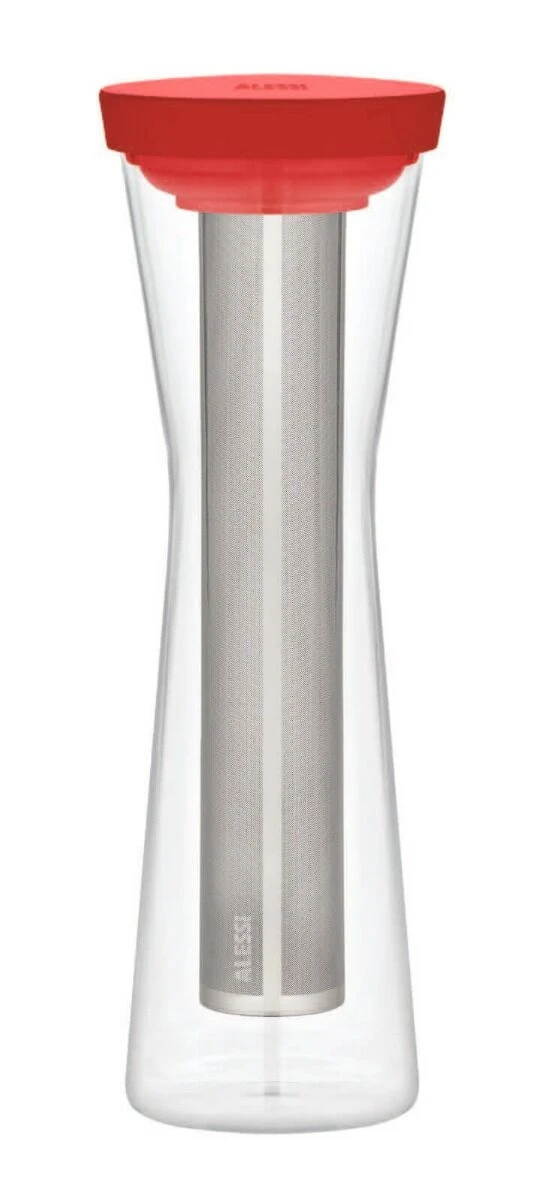 De Alessi Mazagran cold brew koffiekaraf is ontworpen door Giulio Lacchetti en gemaakt van hittebestendig glas, met daarop een rode kunstof dop. In de karaf kan 900ml cold brew koffie gezet worden, wat het best werkt met middel-grove / speciale cold brew koffie. Door de uitneembare roestvrijstalen filter kan de koffie na het zetten tot wel 4 dagen in de koelkast bewaart worden in de afsluitbare beker.